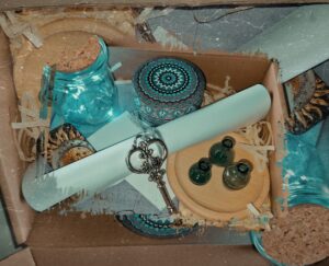 Dans cette box tu trouveras : le manuscrit avec ton Rituel unique créé de mes expériences vécues, clefs de passage, bâton de fumigation fait par mes soins, amulette, bougie, bol pour mettre tes offrandes, carnet, carte oracle, et d’autres variantes en fonction des saisons selon mon intuition.